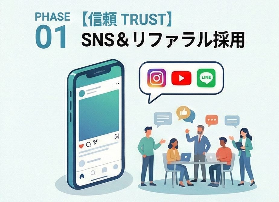 0円採用を実現する 「信頼」 の構築 若い世代は企業をより先にSNSで検索するため、 職場の 「嘘のない資」 を見せることが最大の採用PRになります。